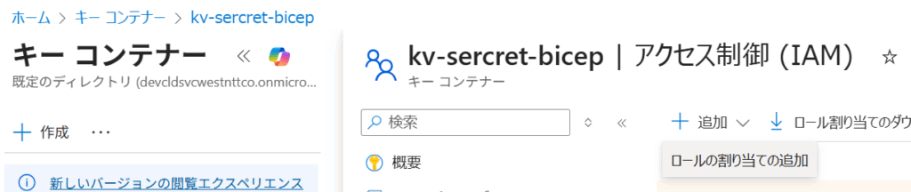 ポータルからキーコンテナのIAMに移動してロール割り当ての追加。