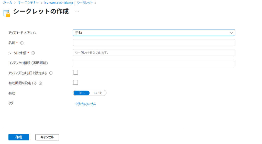 今回はとりあえずWindowsServerのパスワードだけ「vm-admin-password」という名前で作成しました。