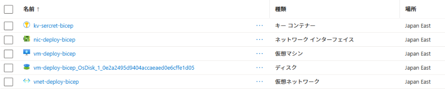 ※全然本筋と関係ないですが、NICの名前を間違えてデプロイしてしまいvm-deploy-bicepからvm-deploy-bicep-nicになっています。前の名前のリソースは残置され新しいNICリソースができていてややこしかったので前のNICは消しました。