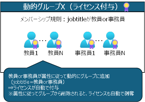 ⇒教員と事務員が動的グループXに追加され、ライセンスが自動で付与される