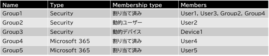 Group1、Group2、Group3、Group4、Group5 という名前の 5 つのグループ グループは、次の表に示すように構成されています。