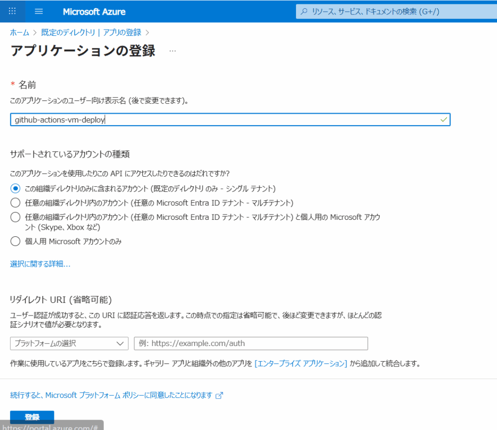 Github ActionsがAzureへ認証するために、Github Actionsをアプリとして登録します。