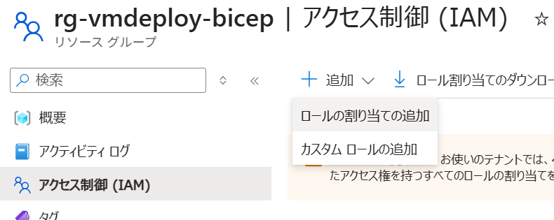 対象のリソースグループのIAMからロールの割り当ての追加を選択し