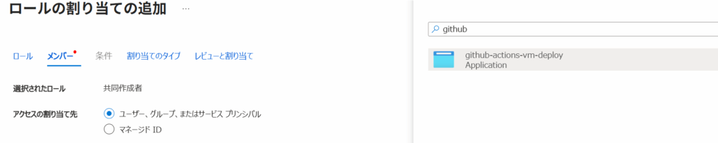 Github Actions用のアプリは作成したので、これに対象のリソースグループに対する共同作成者権限を割り当てます。