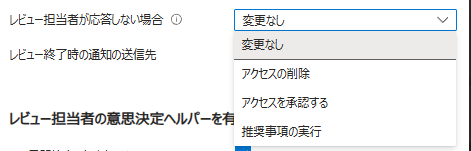 今回の要件として、「レビュー要求に応答しないユーザーはロールから自動的に削除されるようにする必要があります。」とあるので、この項目を「アクセスの削除」に設定することで実現可能になる。