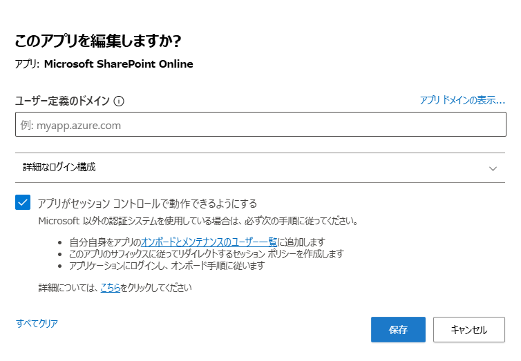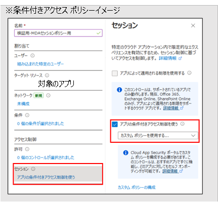 条件付きアクセスにて、「アプリの条件付きアクセス制御を使う」を構成することで、
