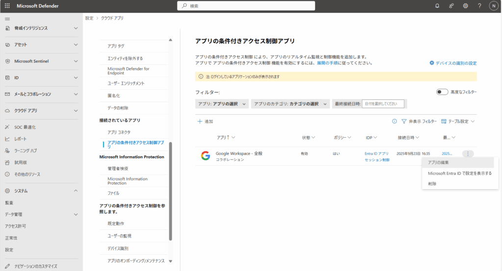 ③Microsoft Defender for Cloud Appsから、App1の「接続されているアプリ」の設定を変更する