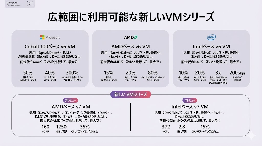 V6シリーズ:主要なCPU(Azure Cobalt 100, AMD EPYC, Intel Xeon)を搭載した最新のシリーズで、従来比で10%以上の価格性能が向上している
