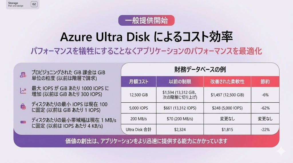 Premium SSDよりさらに高いIOPSなどを提供するUltra Diskが課金単位を刷新し高IOPSを維持したままコスト最適化が可能に刷新された。