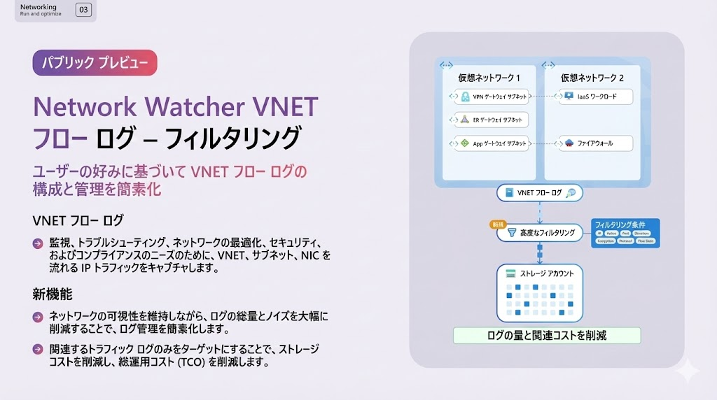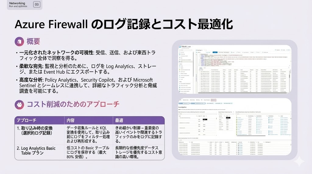 監視のコストにおけるログ保管が占めるコストが大きいため、Network WatcherやAzure Firewallのログ収集時に、必要な情報だけをフィルタリングして保存する機能を追加。
