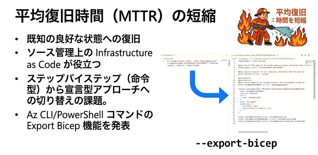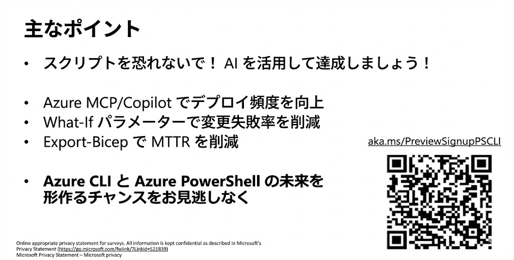 Azureの管理において、手動操作からスクリプトによる自動化、さらにはIaCへの移行を支援するための新機能とAI活用法の紹介です。