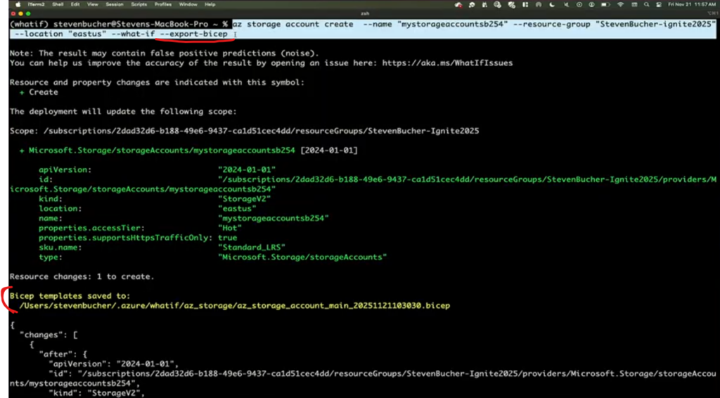 通常の実行コマンドに–export-bicepというパラメータを追加することで、これから作られるリソースのBicepファイルを自動生成しエクスポートしてくれます。