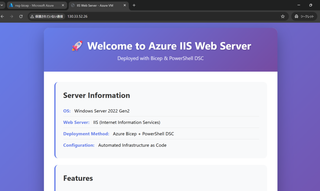 ブラウザからも接続が確認できます。(リポジトリではNSGでTCP443解放していますが、SSL証明書は入れていないのでこっそり80解放に書き換えています)