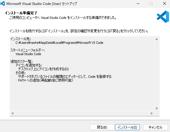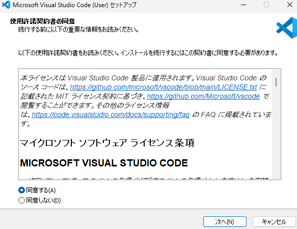 VSCodeのインストーラーをホームページからダウンロードします。