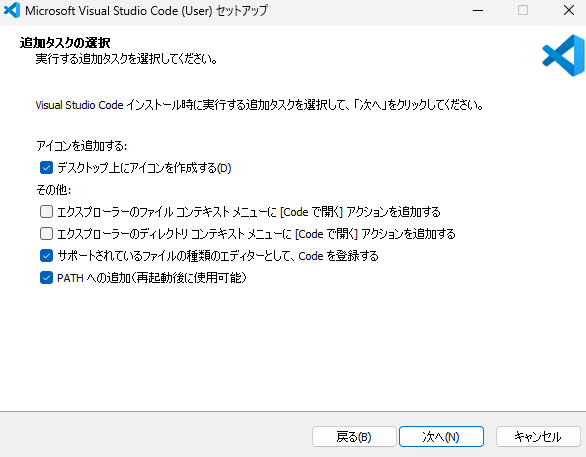 追加タスクの選択をします。アイコンの追加以外は既定のままでOKです。