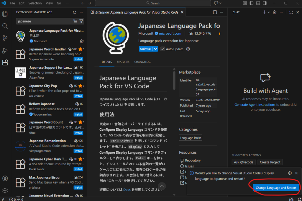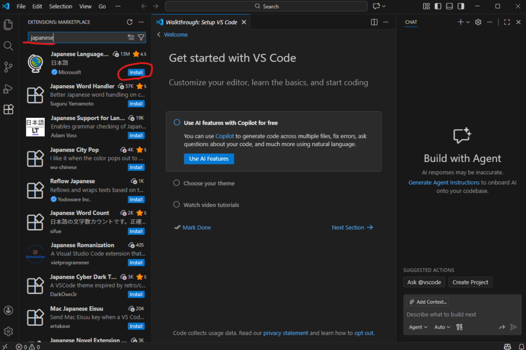 検索ボックスで「japanese」と検索し、Japanese Languageの拡張機能をインストールします。