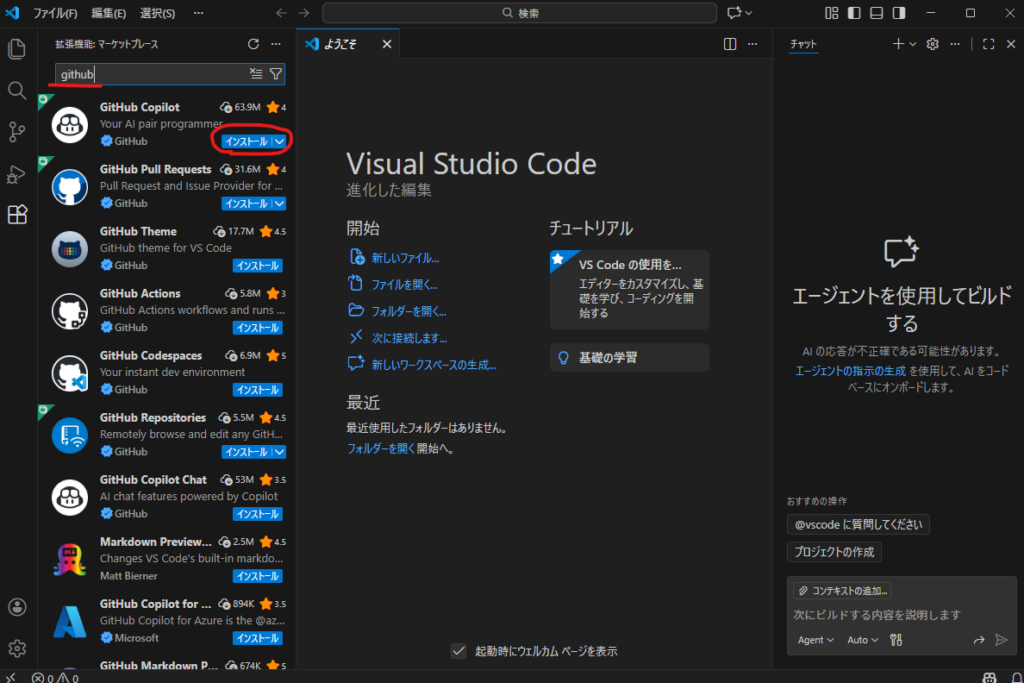 拡張機能から「github」と検索し、GitHub Copilotをインストールします。