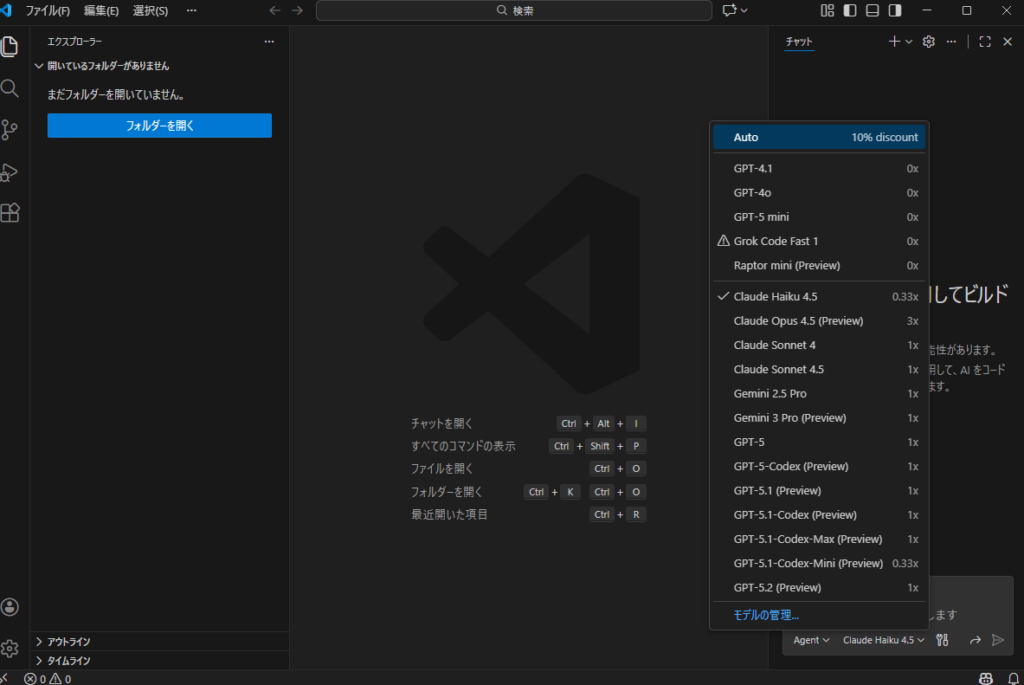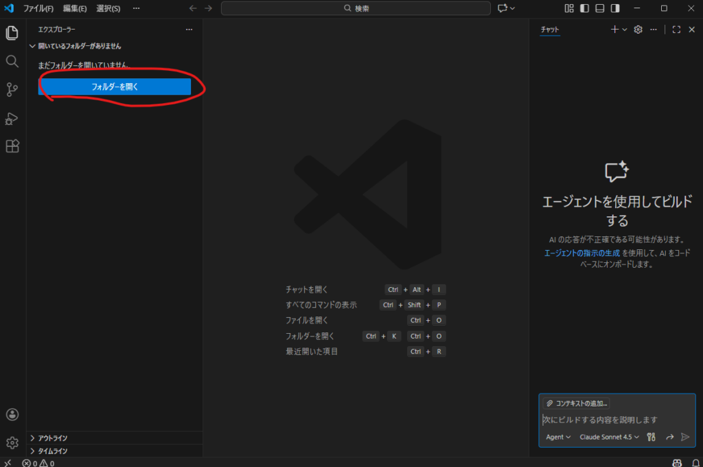 フォルダーを開くから適当なフォルダを選択してください。