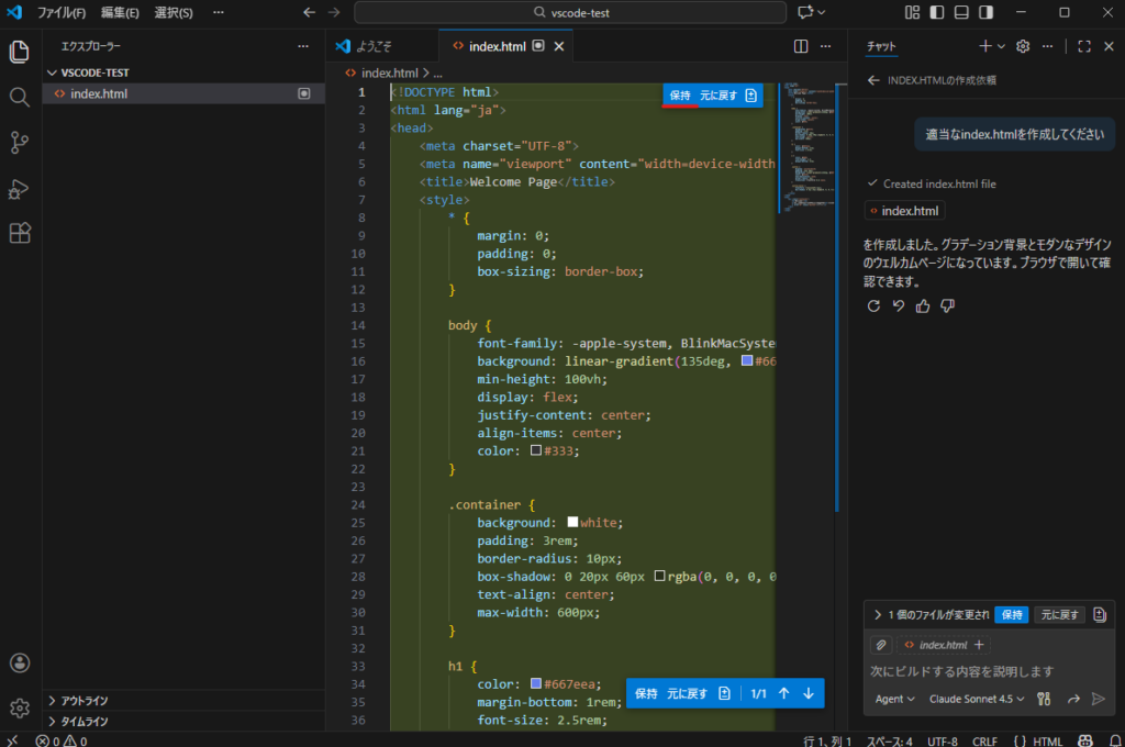GitHub CopilotはVSCodeに組み込まれたCopilotで、プロンプトで指示を出すとある程度適切にコーディング、ファイル作成/編集、コマンド実行を行ってくれます。