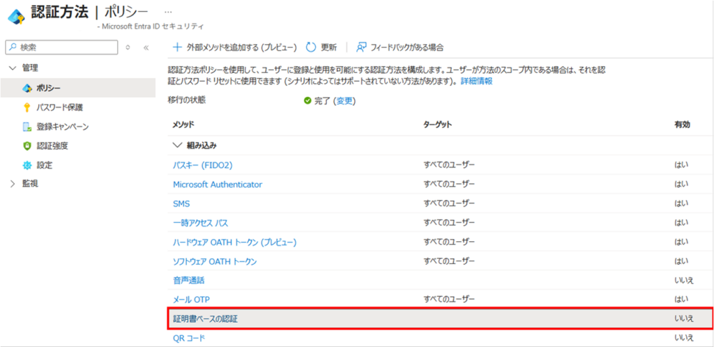 ※Entra管理センター>セキュリティ>認証方法>ポリシーより、「証明書ベースの認証」の設定が可能