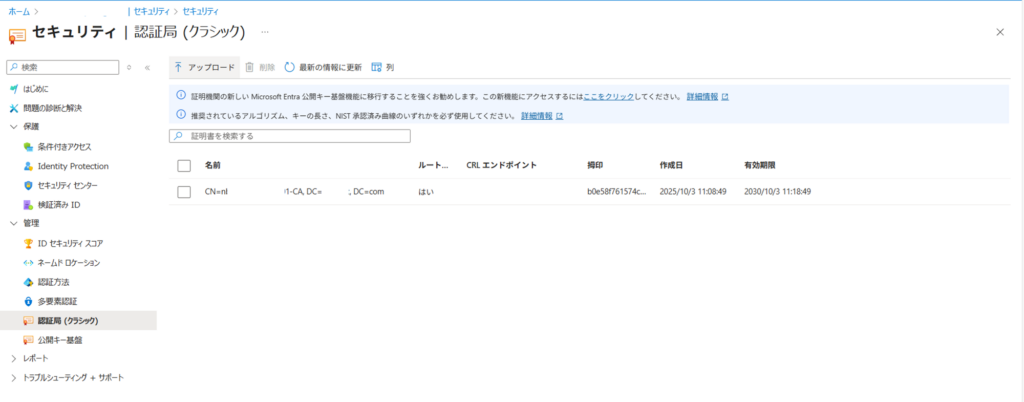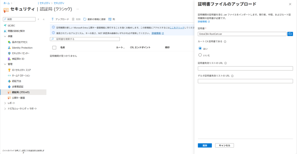 ※Entra管理センターより、セキュリティ>認証局(クラシック)よりアップロード可能