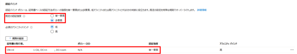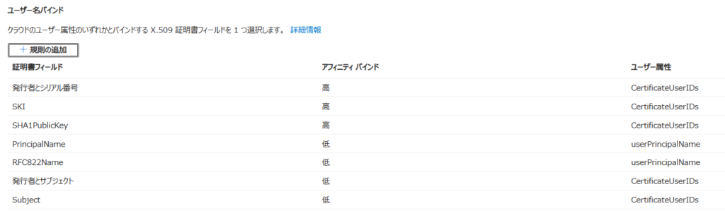 ※ただし、認証バインド設定の「必須のアフィニティバインド」の設定が「高」の時は、アフィニティバインドが「高」の証明書フィールドを1つ以上満たす必要がある