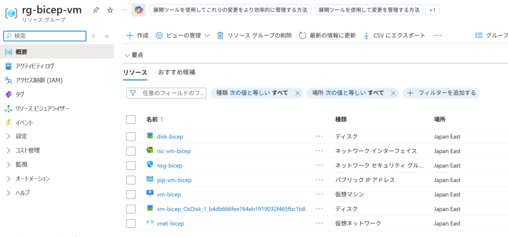 az group create --name rg-bicep-vm --location japaneast //リソースグループの作成