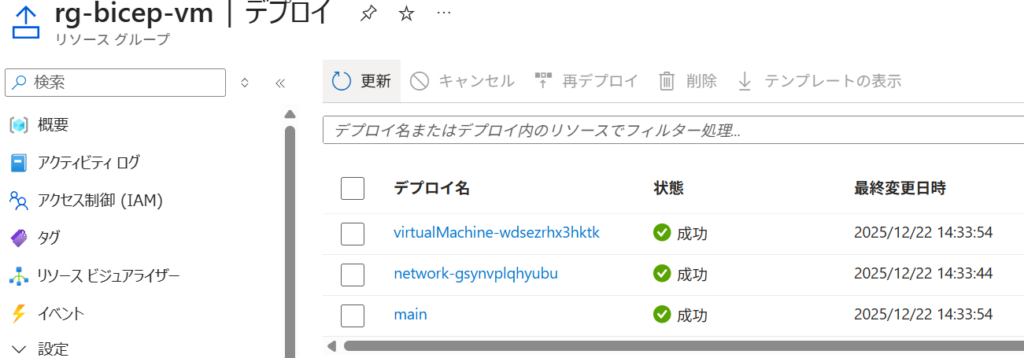 しかしながら、templateでBicepファイルを呼び出している場合は、冪等性により差分だけが反映されます。