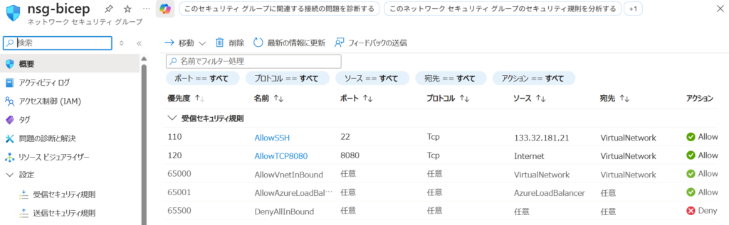 VMを作っているBicepファイルがあるので、このNSGを変更する過程で確認してみます。