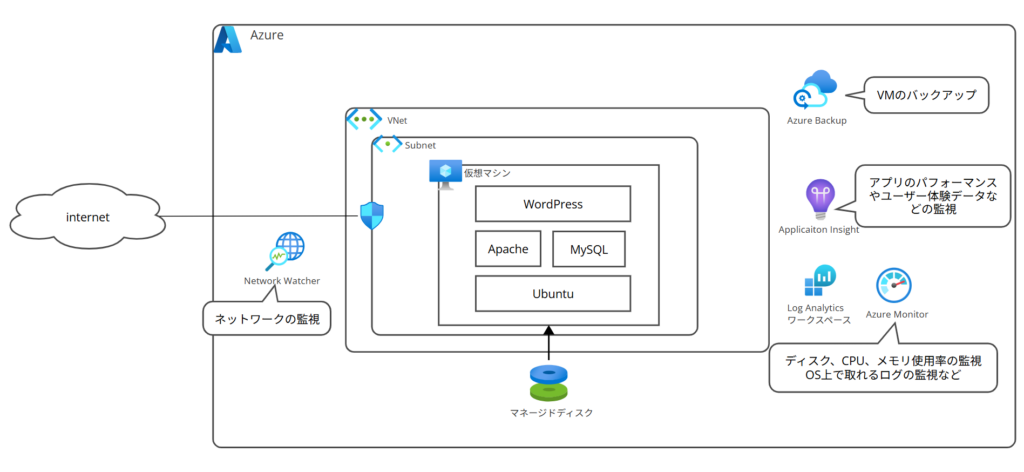 VM1台のWebサーバーに対する監視としては過剰ですが、学習のために今回は仮想ネットワークフローログの取得とトラフィック分析による可視化を採用してみます。