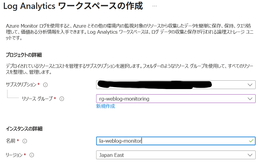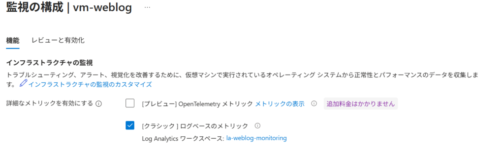 ここで、Log Analyticsワークスペースは一元管理がWell-Architected Frameworkの推奨なので、VMログチェックの時に作成したものを選択します。