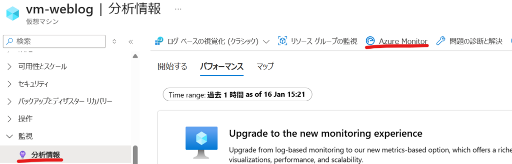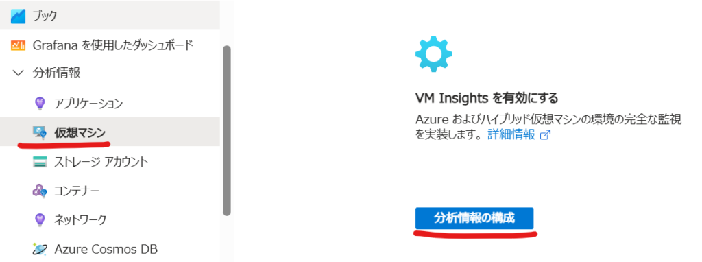 1.Azure Portalの「監視」→「仮想マシン」を選択し、分析情報の構成を選択します