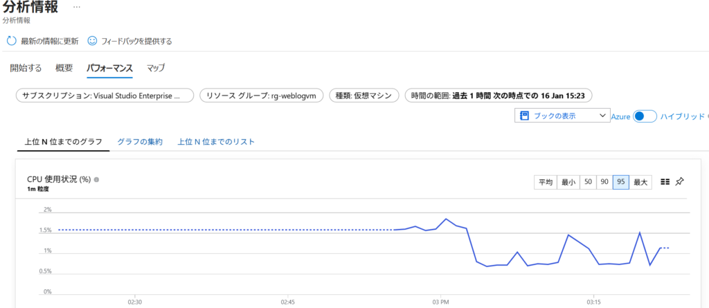 5.仮想マシンのリソースから「分析情報」→Azure Monitorへと進みパフォーマンスタブで視覚化されたメトリック情報を確認できます。