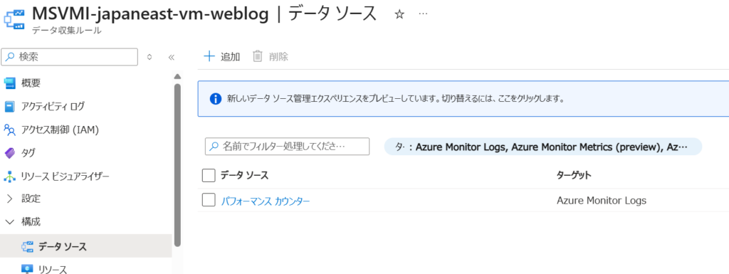 先ほど作成されたDCRから「データソース」→「パフォーマンスカウンター」と進みます。
