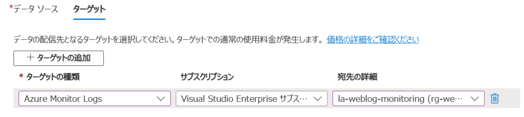 3.その後、ターゲットの選択で送付するLogAnalyticsワークスペースを選択し、データソースの追加をします。