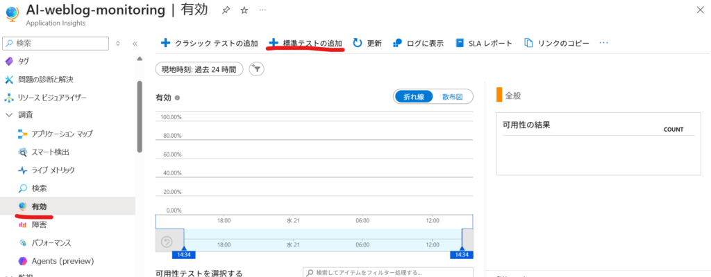 1.デプロイしたApplication Insightsの「有効」から「標準テストの追加」を選択します。