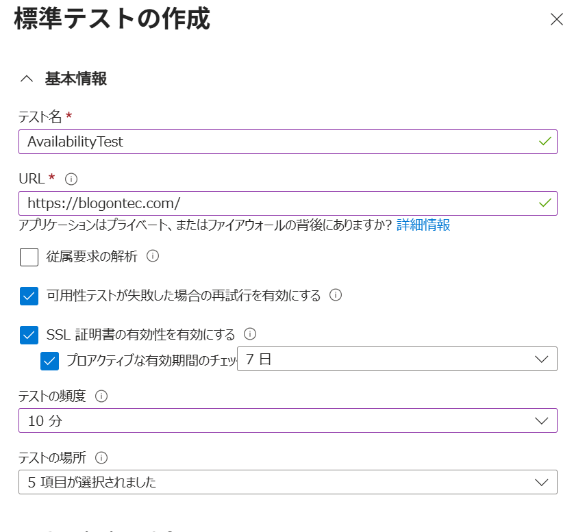 テストの場所は今回、Japane EastやEast Asiaなど適当に5か所選択しており、選択したリージョンから10分おきに死活監視を行うようになります。