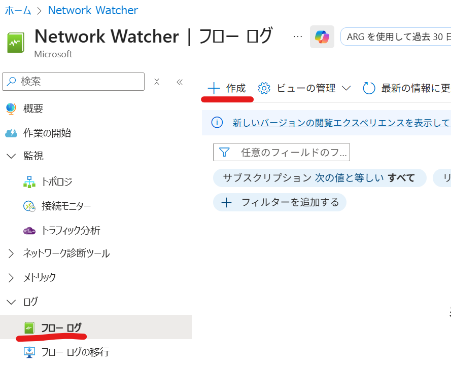 3.その後、Network Watcherからログ→フローログ→新規作成を行います。