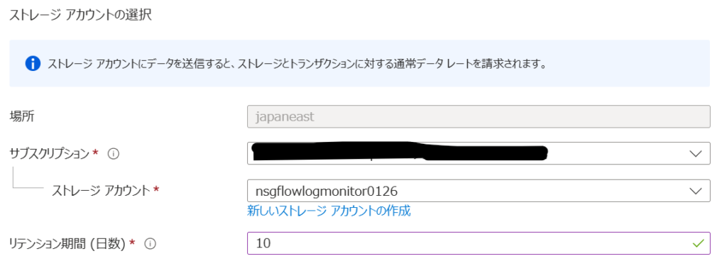 5.ログの保管先を先ほど作成したストレージアカウントに設定します。