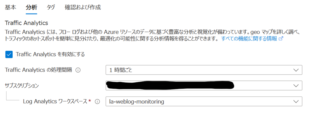 6.分析タブでTraffic Analyticsを有効にし、LogAnalyticsワークスペースを選択し作成を行います。