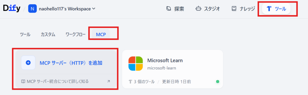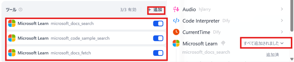 保存するとDifyにMicrosoft Learn MCPが登録されます。