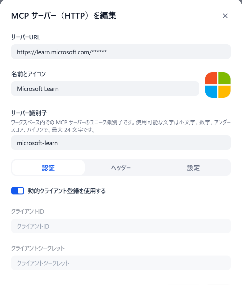 認証・ヘッダー・設定:なにもなし(Microsoft Learn MCPは認証なしで使える)