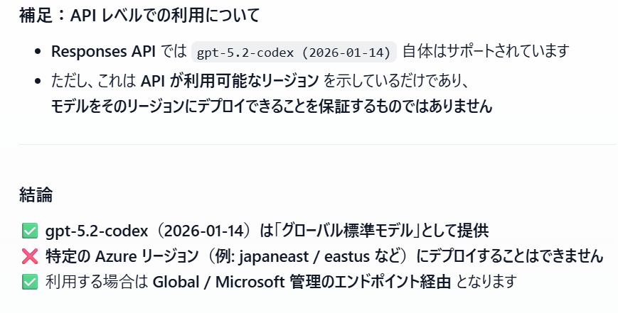 前回誤答したFoundryでGPT-5.2をデプロイできるリージョンを聞いてみて、間違った回答が返ってきた問題ですが、よくLearnを確認したところデプロイ方法によって色々変わるみたいです。